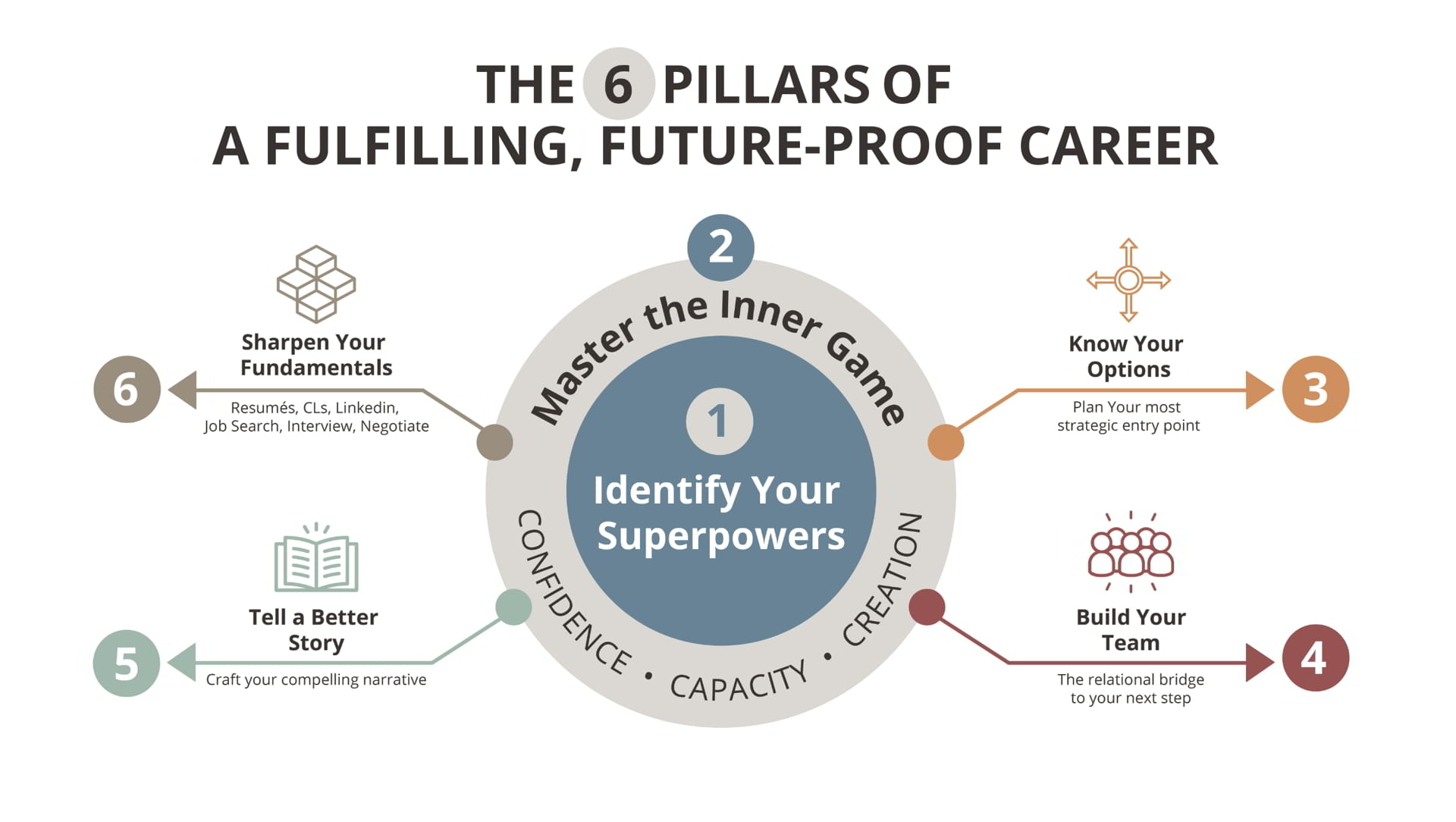 In the Career Accelerator, we do a deep dive into each of the 6 pillars, paying particular attention to Pillars 1 and 2, which are the foundation out of which clarity, confidence, ease, impact, and excellence flow.